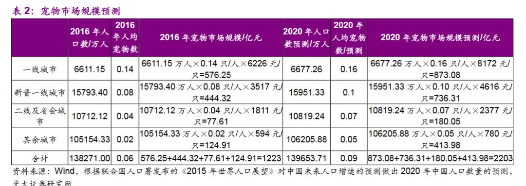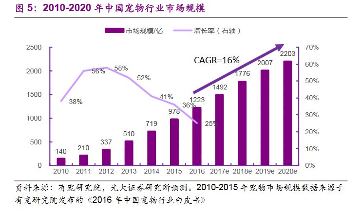 2020年中国宠物市场规模将超过2000亿元。根据我们的预测,2016年和2020年中国宠物行业市场规模分别为1223亿元和2203亿元,CAGR为15.85%。