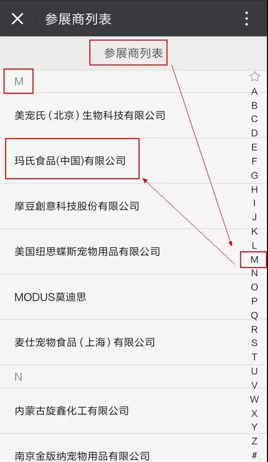 找到自己的企业邀请函进入邀请页面,例如:我要查找“玛氏食品有限公司”,可以直接点击“M”即可跳转到以m开头的企业