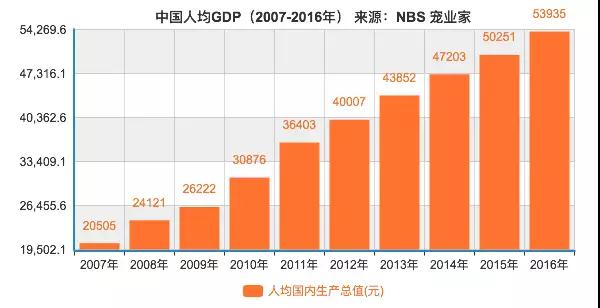 那么假设宠物产业在一个国家人均GDP达到3000-8000美元出现快速发展, 对应到中国大致就是2007年至2016年。