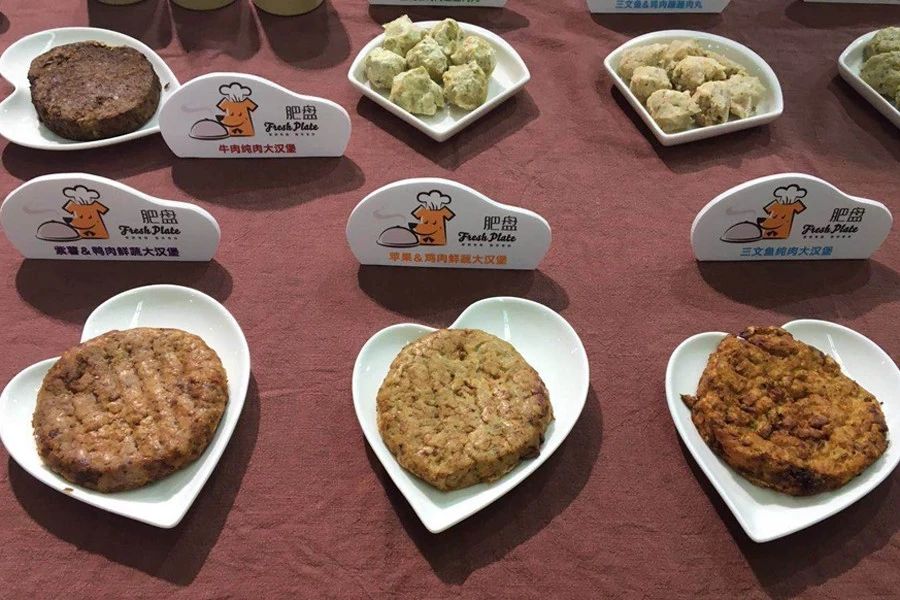 发布会的重头戏为宠物食品。其中初创企业“肥盘”发布新品鲜食冷冻料理包系列,共10款产品,其中有3款犬汉堡、3款犬丸子以及4款猫食物。