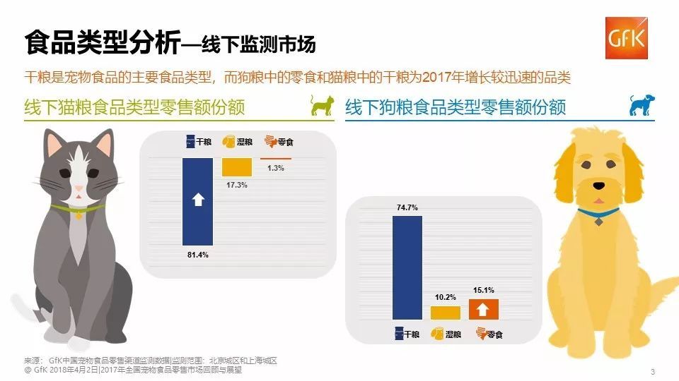据GfK京沪线下监测数据显示,狗粮仍是线下市场销售的主要品类,2017年市场份额为65.2%,同比增速有所放缓,其中零食呈现了较好的上涨趋势;猫粮在上一年度市场份额已超过了整体市场的1/3,且仍保持着两位数的增长,其中干粮为呈现上涨趋势的食品类型。产品格局正发生悄然的变化。