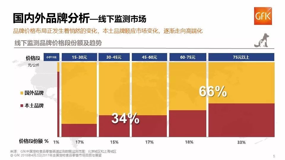 在中国的宠物食品市场中,国外品牌仍处于主导地位。然而,据GfK京沪线下监测数据显示,本土品牌正在快速崛起,2017年零售份额已超过整体市场的1/3,其增速要远超过国外品牌,特别是在价格布局上,顺应了整个市场的变化,逐步走向高端化。