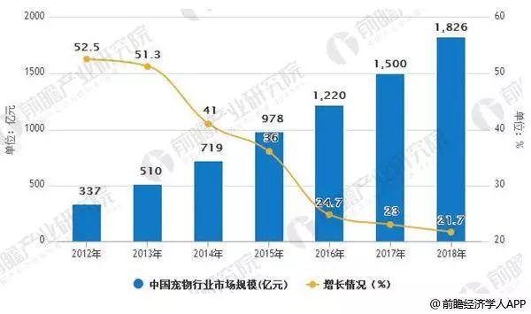 据前瞻产业研究院发布的《宠物用品及服务行业市场调研与投资预测分析报告》数据显示,2012-2016年我国宠物行业市场规模不断扩大,五年年均复合增长达到37.94%,增长十分迅速。2016年,中国宠物行业市场规模达到1220亿元,同比增长24.7%。尽管近年来我国宠物行业市场规模增速有所放缓,但仍然能保持高于20%的增速。预计2017年中国宠物行业规模将达到1500亿元,未来3-5年宠物行业将继续维持20%以上的高增长,有望在2018年市场规模实现1826亿元,同比增速21.7%。