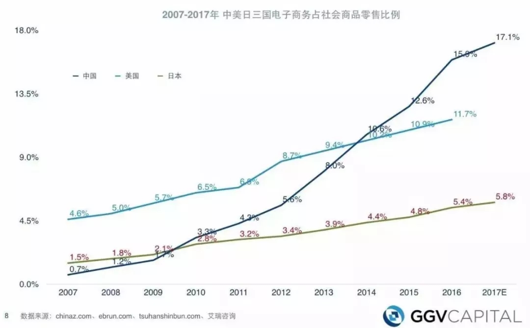 2007-2017年中日美三国电子商务占社会商品零售比例