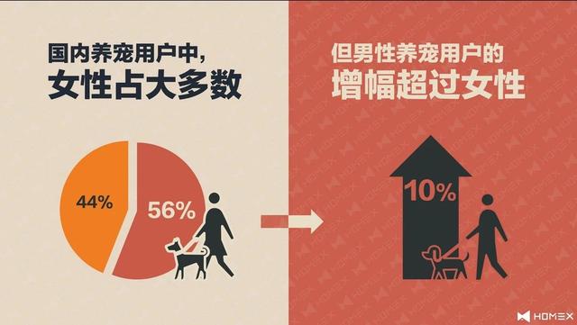 数据显示,截止2017年国内养宠用户以女性居多,占总人数56%。男性养宠人数虽然少于女性,占总数的44%,但较之2016年上涨10%,增幅超过女性养宠人数。