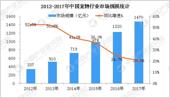 随着宠物市场诞生后人们饲养宠物观念的逐渐普及,中国宠物行业经过二十多年的发展已逐渐形成规模。2012-2017年我国宠物行业市场规模不断扩大,年均复合增长达到34.26%,增长十分迅速。据统计2017年中国宠物行业市场规模达到1470亿元,同比增长20.5%。尽管近年来我国宠物行业市场规模增速有所放缓,但仍然能保持高于20%的增速。