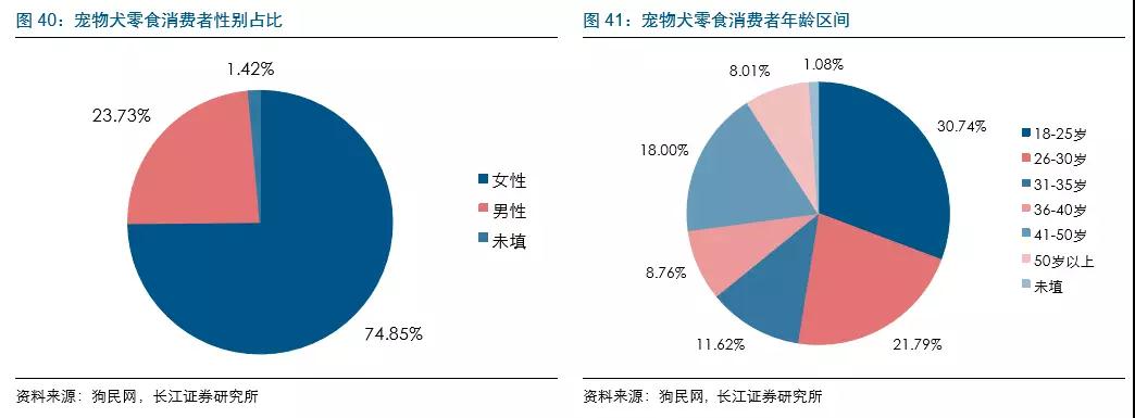 从淘宝大数据来看,购买宠物犬零食的年轻消费者占比较高,消费的客单价相对较低,2017年购买宠物犬零食的消费者中女性占比为74.85%,30岁以下的消费者占比在52%左右,81%的消费者客单价集中在30元以下。