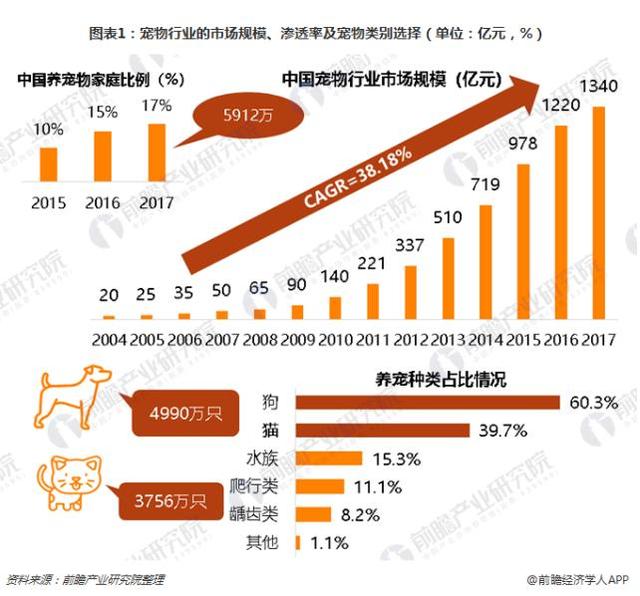 2017年,中国宠物行业市场规模达到1340亿元,同期美国宠物市场规模为695.1亿美元,约是我国的3.5倍。2004-2017年宠物行业市场规模复合增长率为38.18%,行业保持高速发展;年增速有放缓趋势,逐渐向稳定与成熟期过渡。