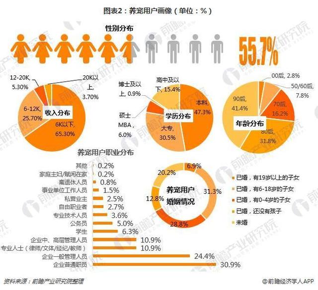 整体而言,养宠人群的特征基本稳定,主要特点为年轻、高学历、女性。在养宠用户中,女性占比55.7%;男性占比为44.3%,较去年增长10个百分点,越来越多的男性开始养宠物。