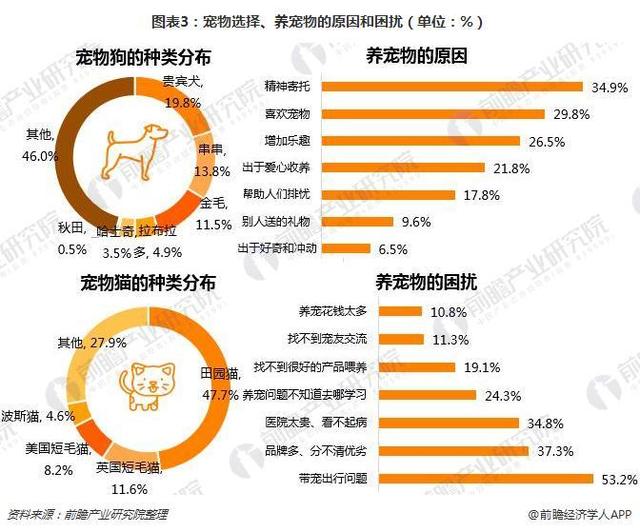 在犬种选择上,综合来看,贵宾犬占比19.8%;金毛占比11.5%;其次是拉布拉多、哈士奇和秋田犬。从性别看女性偏好小型犬,尤其爱养贵宾犬;而男性偏爱大型犬,金毛。情感需求和喜欢动物是养宠的主要原因,比重分别为34.9%和29.8%;但养宠也带来了较多困扰,带宠物出行成为养宠用户最大的困扰;其次是在宠物的食品选择上,品牌较多,分不清优劣;宠物医院作为新兴服务业,收费相对昂贵,给宠物看病也是养宠用户较大的困扰。