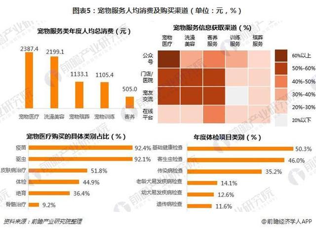 宠物服务则包括宠物医疗、洗澡美容、宠物殡葬、宠物训练、寄养等。从年度人均总消费看,宠物医疗年度人均总消费最高,为2387.4元;洗澡美容年度人均总消费为2199.1元,排名第二。