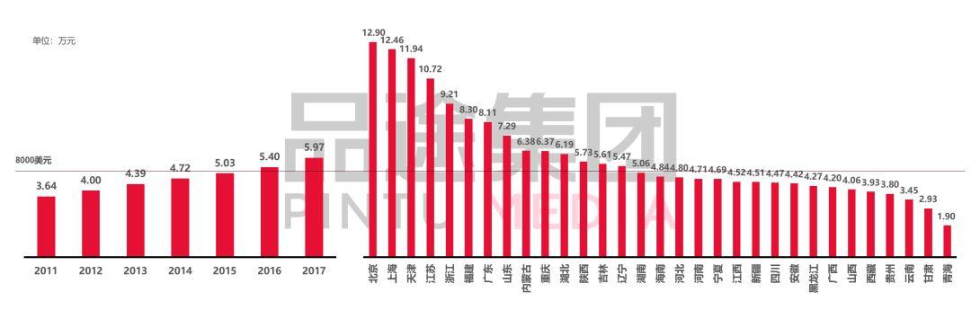 2011-2017年人均GDP分布及2017年各省市人均GDP分布