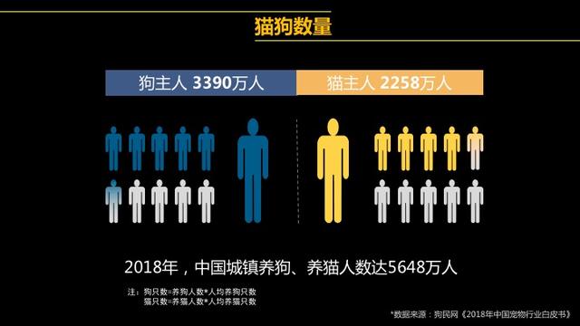 据《2018年中国宠物行业白皮书》(消费报告)调查显示,2018年中国城镇养宠用户已经达到7355万人(含水族),其中城镇养狗、养猫人数达5648万,养狗的人依然占多数,达到3390万人,猫主人为2258万人。