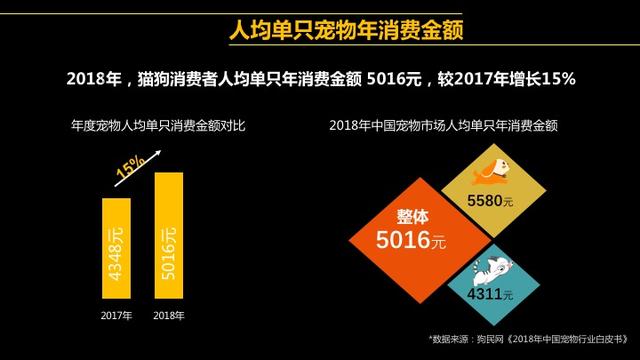 那么养一只宠物要花多少钱?经过测算,2018年猫狗消费者人均单只年消费金额5016元,相比2017年增长15%。数据表明,宠物行业的消费更加升级,主人们在为宠物消费的过程中更加“不遗余力”。