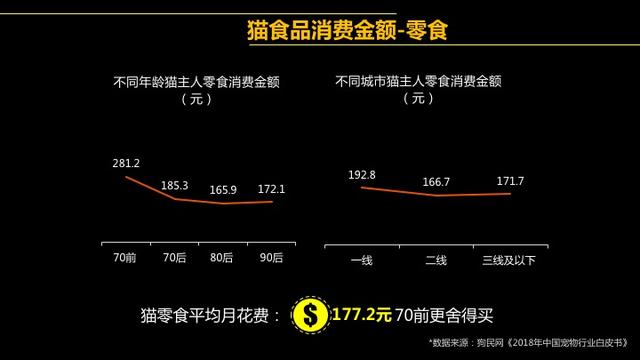 值得注意的是,在细分猫狗消费市场之后,一些隐藏信息也浮出了水面。比如调研结果显示,虽然养宠消费人群以80后、90后的年轻人居多,但实际上70前的猫主人更舍得为自己的猫咪花钱购买主粮、零食和保健品。