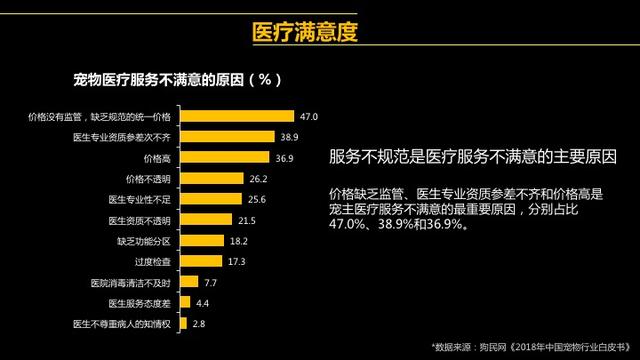 但也应看到,当下宠物主对医疗服务满意度并不高,47.1%的宠物主对医疗服务感到一般甚至是不满意。究其原因,宠物医院价格缺乏管理、医生专业资质参差不齐与价格高构成了宠物主不满意的最重要因素。