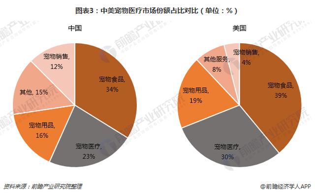 目前,我国宠物医疗行业的市场规模约为300亿元,在宠物行业整体市场份额中占比约为23%,仅次于宠物食品行业。而相较于美国,美国宠物医疗行业市场规模已经超过1200亿元,宠物行业占比为30%,可见中国宠物医疗行业不论是在市场规模,还是在市场份额占比上,都同美国存在较大差距,还处于行业发展初期,未来发展空间巨大。