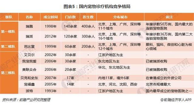 但就目前来看,国内宠物医疗行业诊疗机构发展还处于初步发展阶段,专业宠物医院或者大型连锁医院并不多,多以小型诊疗机构为主。总体而言,可以将国内宠物诊疗划分为三个梯队,其中瑞鹏和瑞派发展规模较大,已在全国范围内开启连锁化经营,位居第一梯队;而其他机构则规模偏小,且相对零散,日常经营尚未在全国实现完全标准化。