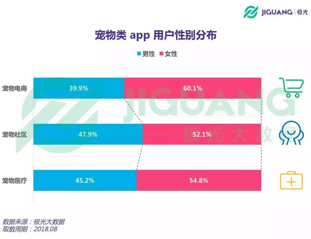 根据数据表明,宠物类APP用户多为女性。在宠物电商类APP中表现的尤为明显,有超过60%的宠物垂直电商APP使用者为女性。即便是在用户性别分布相对均衡的宠物社区和宠物医疗类别app中,女性用户的占比也都超过50%。