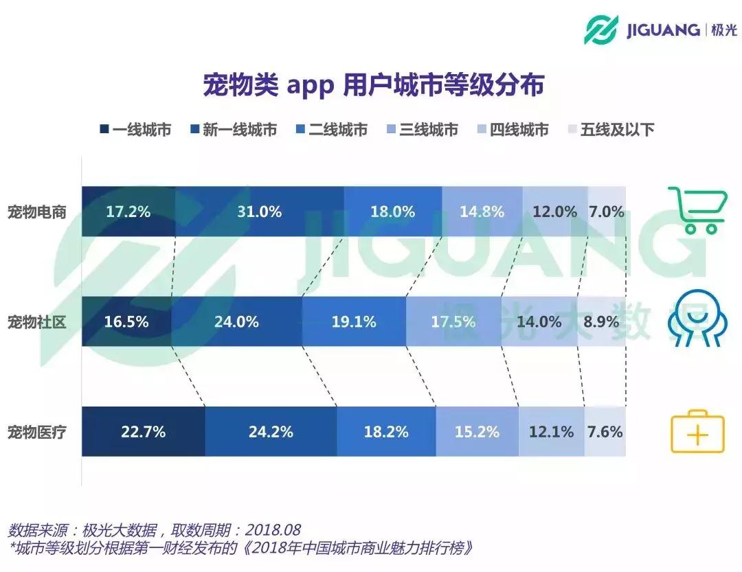 和宠物电商以及宠物社区app相比,宠物医疗app用户对一线城市的集中程度明显较高。截至今年8月份,有22.7%的宠物医疗app用户分布在一线城市,宠物电商和宠物社区分别为17.2%和16.5%。相对而言,宠物电商app用户对于新一线城市有着更高的集中程度,新一线城市的用户占比达到31%。