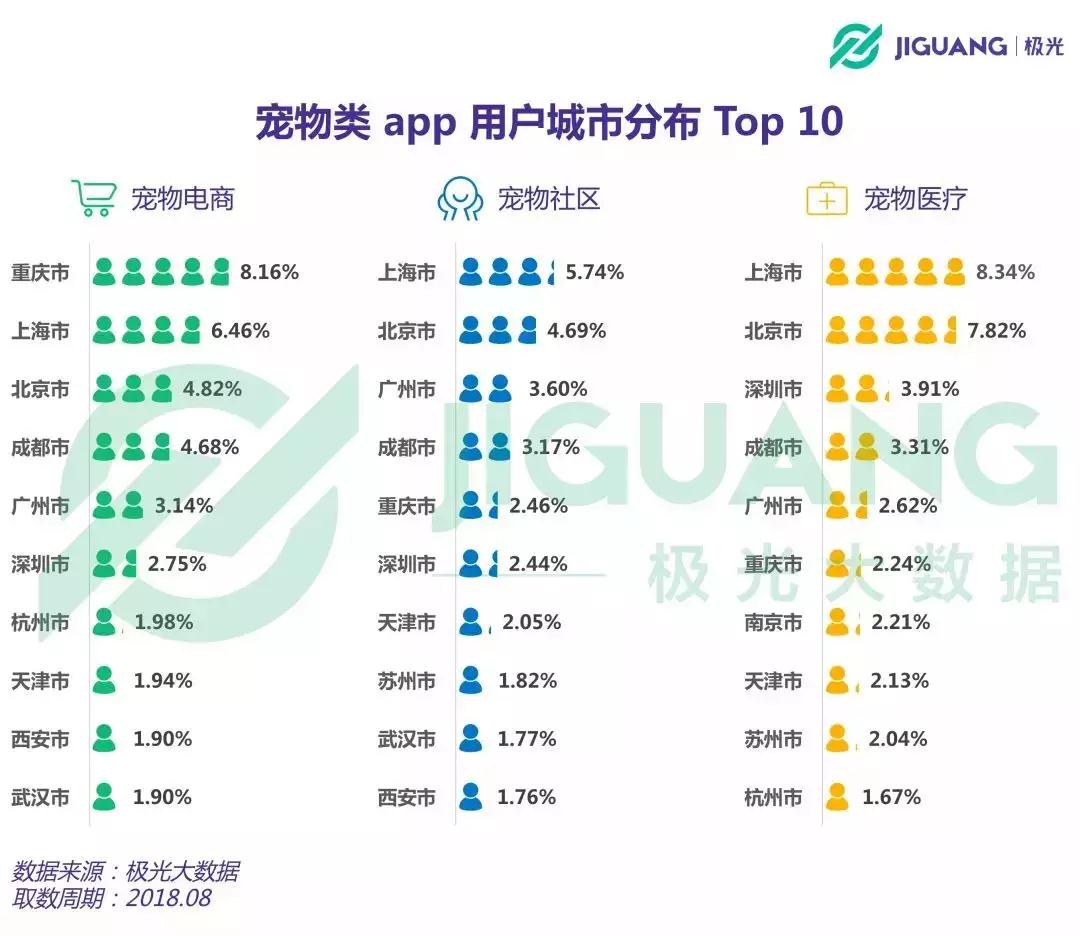 具体到城市而言,重庆的宠物垂直电商类APP使用人数最多,上海,北京分列2、3位。而宠物社区和宠物医疗类APP使用人数最多的城市均是上海。