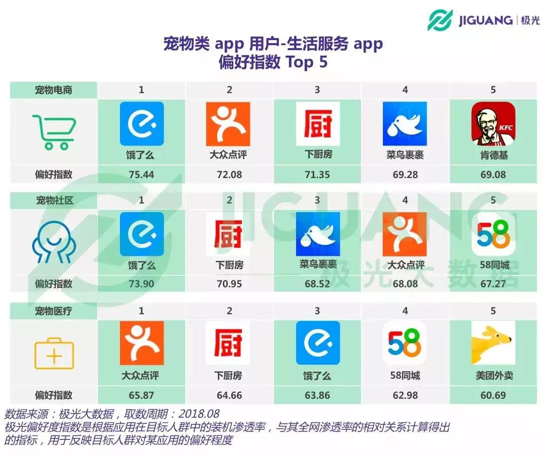 和全国移动网民相比,宠物类app人群对于“吃”的执念似乎也更加显著。极光偏好指数显示,三类宠物app用户对饿了么、大众点评和下厨房等生活服务app均有着较高的偏好度。