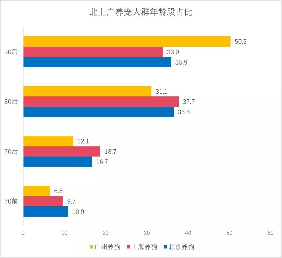可以看到,广州的狗主人中80后、90后人群能够占到80%以上,其中90后更是占到一半以上,远高于北京、上海地区。