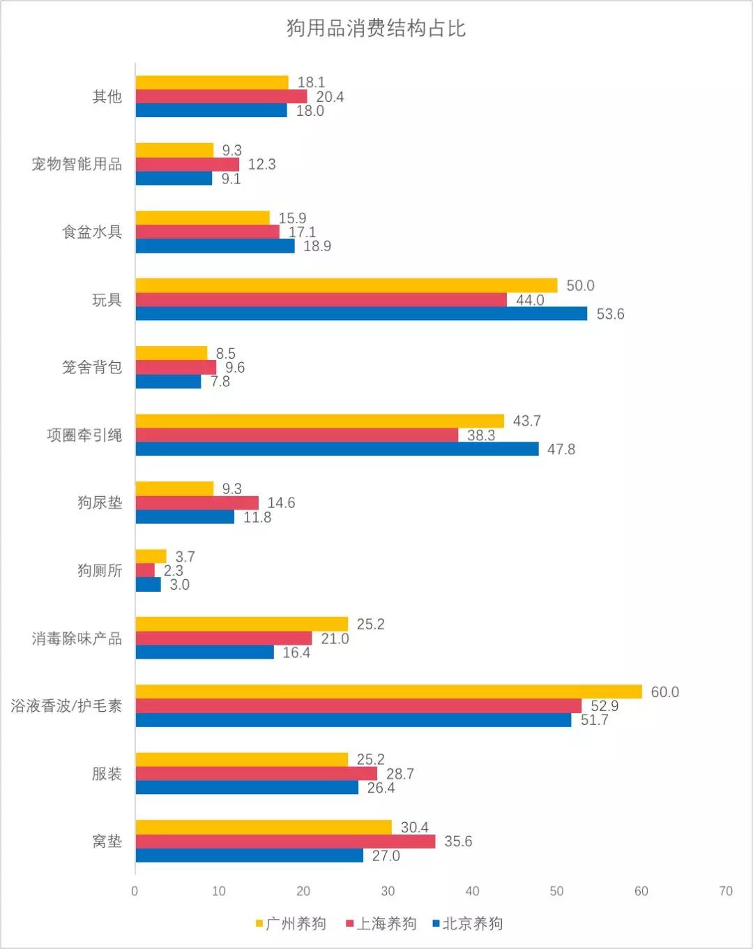 用品方面,北上广三城消费偏好差异不大,其中北京狗主人最喜欢购买狗玩具,上海与广州狗主人最爱沐浴香波/护毛素,广州狗主人格外关注狗狗本身和养狗的环境卫生,其购买消毒除味产品与服装类并列宠物用品的第五名。