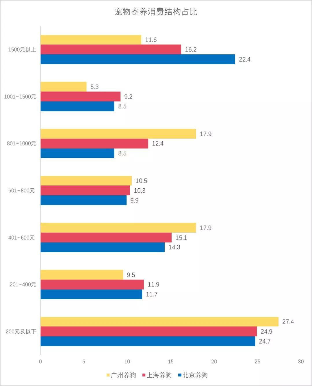 有意思的是,北京的狗主人在寄养上的消费金额呈两极化分布,年平均花费在1500元以上的狗主人占比达到22.4%,远超广州狗主人的占比。