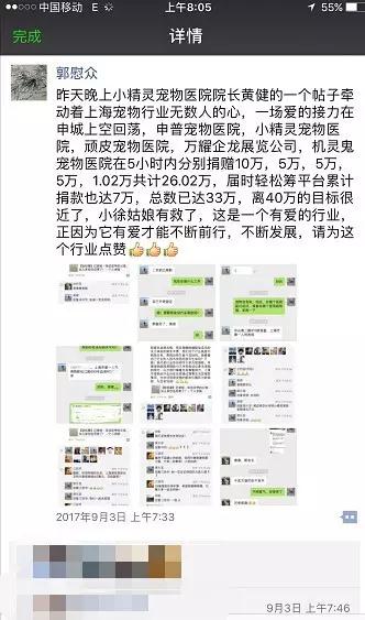 短短五个小时,申普宠物医院、小精灵宠物医院、顽皮宠物医院、万耀企龙展览有限公司、机灵鬼宠物医院分别捐赠10万、5万、5万、5万、1.02万、1万、1万、同时轻松筹平台累计捐款也达8万,15个小时后40万全部筹款全部筹齐。然而,善良的姑娘提前关闭了筹款平台,说:钱够了,把机会留给更需要的人。