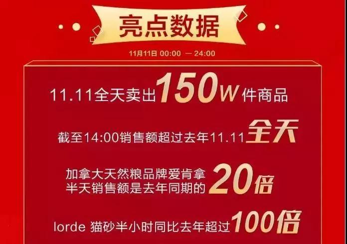 11月16日,京东官方公布了双11的宠物园艺战报。双十一当天京东平台卖出商品150万件。截至14:00销售额超过去年11月11日全天,加拿大天然粮品牌爱肯拿半天销售额是去年同期的20倍,Lorde猫砂半小时同比去年超过100倍,半天卖出鱼缸15000个,进口园艺工具品牌嘉丁拿一小时销售额是去年的10倍。