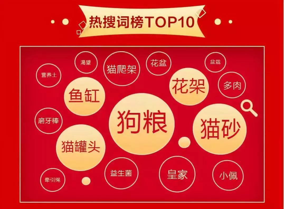 从热搜词榜Top10来看,“狗粮”、“猫砂”、“猫罐头”成为最热热搜词。此外,皇家、小佩、渴望等品牌上榜、牵引绳、磨牙棒等产品上榜。