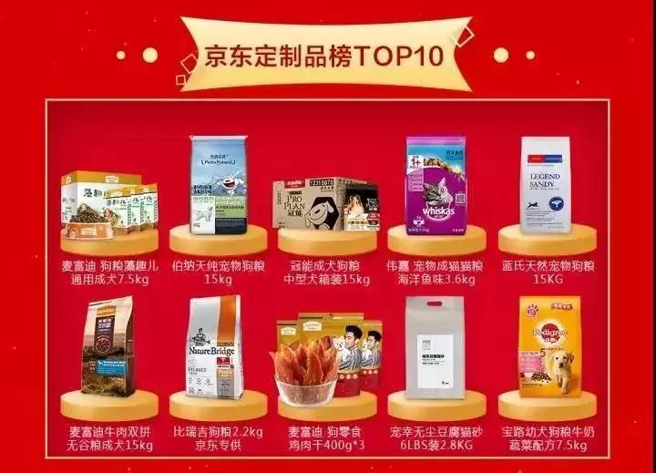 在京东定制品销量榜TOP10中,麦富迪狗粮藻趣儿通用成犬7.5kg最受铲屎官们的喜爱,伯纳天纯宠物狗粮15kg、冠能成犬狗粮中型犬箱装15kg、伟嘉宠物成猫猫粮海洋鱼味3.6kg、蓝氏天然宠物狗粮15kg、麦富迪牛肉双拼五谷粮成犬15kg、比瑞吉狗粮2.2kg京东专供、麦富迪狗零食鸡肉干400g*3、宠幸无尘豆腐猫砂6LBS装2.8kg、宝路幼犬狗粮牛奶蔬菜配方7.5kg等宠物粮悉数上榜。