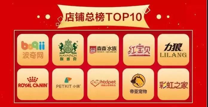 从店铺总榜Top10来看,波奇网、耐威克、力狼、皇家、小佩、鸿通达、帝亚宠物等公司上榜。