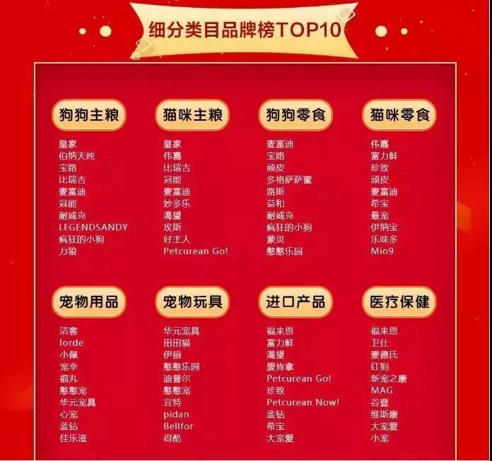 在医疗保健类目下,宠物医药品牌福来恩夺冠,而黑马卫仕冲击到第二,麦德氏、红狗排在三四名位置;在宠物进口类目下,福来恩继续领跑,富力鲜紧随其后,渴望、爱肯拿、GO、NOW等进口纷纷上榜。