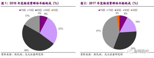 图中分别为16年与17年宠物消费群体年龄的构成,由图可证实刚才的推断,70前属于正在老龄化的群体,但是对比两年的份额几乎没有变化,90后则大幅增长。随着00后开始进入宠物市场将为宠物市场增加新的生力军。
