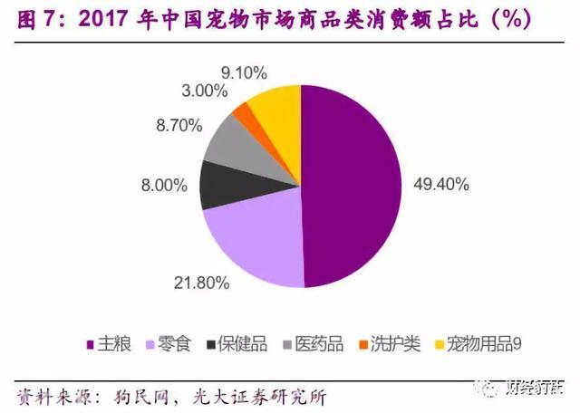 主粮占据了整个宠物市场商品消费额近50%的占比,其他类型的商品,占比比较大的份额也只是总额的21%。