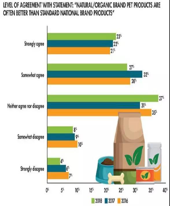 Packaged Facts在今年一季度对于美国宠物主的调查显示,超过一半的宠物主认同“天然/有机宠物产品会比标准化生产的国民品牌要好”,表达“强烈认同”的人数则超过四分之一,这部分人群的数量从2016年开始就在不断增加。