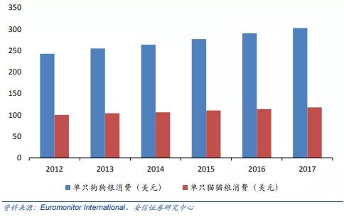 (美国单只宠物饲料消费呈现温和上涨的趋势,来源:安信证券)