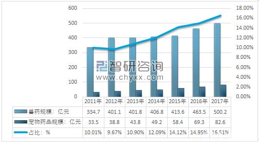 2011-2017年中国宠物药品市场规模及占比兽药比重