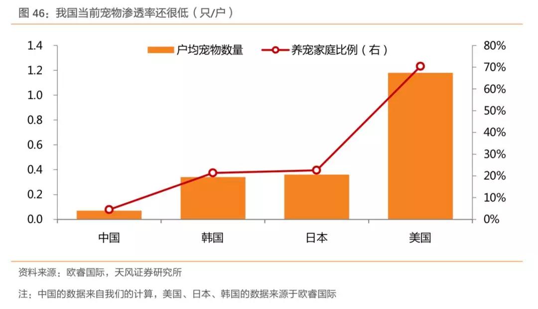 目前我国家庭总数约为4.6亿户,以有效宠物数量3100万计算,户均养宠数量约为 0.07 只,考虑到很多养宠家庭不单只养一只宠物,我国当前的养宠家庭占比约为4-5%,与美国日本等成熟国家存在很大的差距。