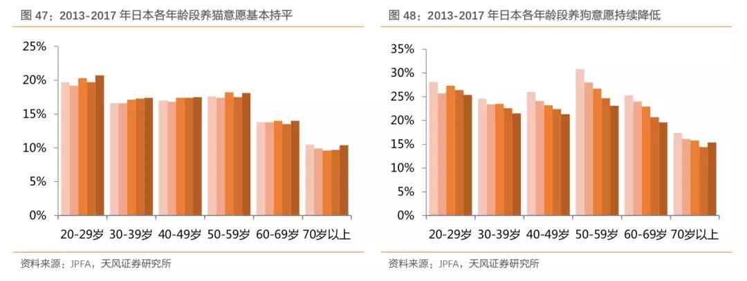 天风证券认为,宠物数量是宠物行业的核心因素,宠物数量能否增长在于养宠意愿能否转化为养宠行为。根据日本养宠意愿调查的结果,2013-2017年日本养猫意愿变动不大,而养狗的意愿持续降低,这也与日本猫狗数量的实际变化相匹配。