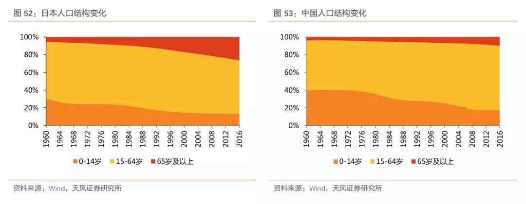 中国目前的人口结构变化和20世纪80-90年代的日本有相同之处。1994年中国生育率降至2以下,在2008年左右一度逼近1.5,随着二孩政策的放开略有回升,但是依旧较低。2016年中国老年人口比例超过10%,且有不断扩大的趋势。