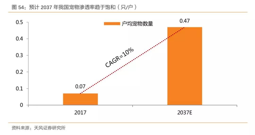 预计2030年后我国宠物数量将逐渐趋于饱和,假设到2037年我国宠物渗透率达到日本的饱和水平,即0.47只,那么我国户均宠物数量的复合增速可以达到 10%。