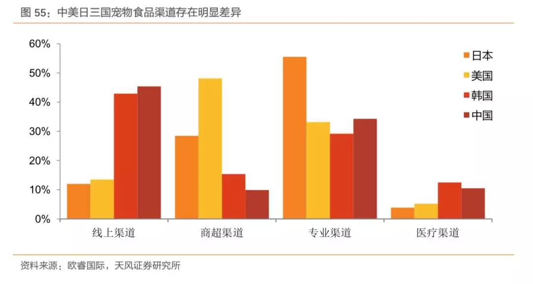 在宠物食品渠道方面,中美日韩都呈现出“二八格局”,但是存在明显的差异,具体表现在:日本“专业+商超”占比84%,美国“商超+专业”占比81%,韩国“线上+专业”占比72%,而中国与韩国类似,也是“线上+专业”的结构,但占比更高,达到80%。