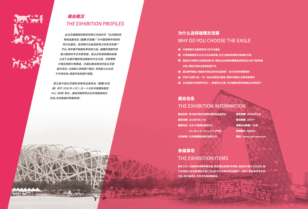 2018第五届北京国际宠物用品展主要围绕宠物食品、宠物用品、宠物医疗保健、宠物产品对宠物相关企业增进行业文化、经验、技术的交流。第五届京宠展有来自国内外经销商、批发商、零售商、宠物医院、等专业观众和名爱宠者参加现场活动,为广大商家搭建一个发布新品、觅求商家、提升品牌、拓展业务的商贸平台。此届2018第五届北京国际宠物用品展展示面积50000平方米,将邀请各个地区200家宠物行业企业参展,参展人数已超过预想的人数。