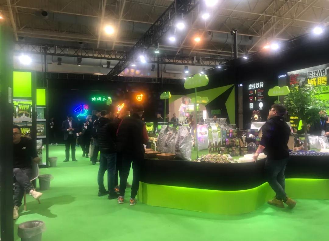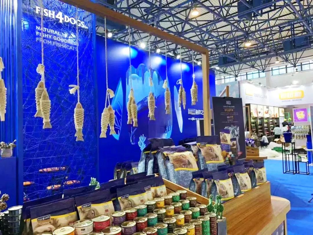 海洋之星的展台一片深蓝,展区挂着海洋风的饰品,契合品牌的深海主题,海洋之星也是来自深圳的品牌,主打产品是他们全鱼宠粮,