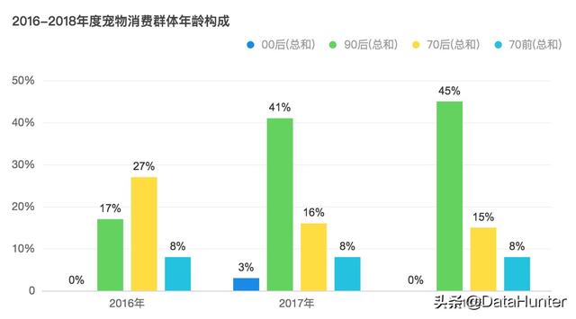 一个很有意思的现象:90后用户在2017年快速增长成为宠物消费的主力军,并呈现持续增长的趋势。在2016年80后养宠用户是主力人群达48%,90后占比仅为17%。到2018年时,90后一路攀升至43%,成为饲养宠物的主要人群。究其原因,目前很多80、90后独自在一线城市工作,工作压力大,生活节奏快,而此时宠物是孤独生活的慰藉,是高度压力生活的情感诉求。