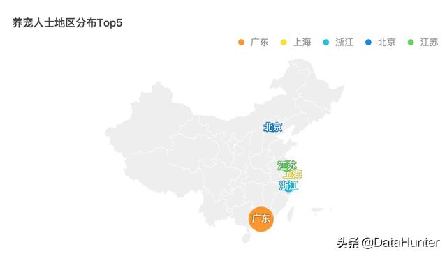 铲屎官们则集聚在以下5省:广东第一,占比14.74%;浙江第二,占比8.66%;剩余顺位下来分别是江苏、北京和上海。总体而言,77%的铲屎官分布在一二线城市。