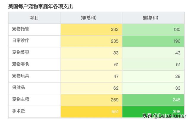 在美国,每户宠物狗、猫家庭年各项支出在1000美元以上(1只),而国内养狗、养猫用户的年均宠物消费额分别为5400和5856元,差距看似不大,但由于美国家庭的宠物保有量较高(养1只以上),中国用户的消费额就仅为美国的48%和76%了。